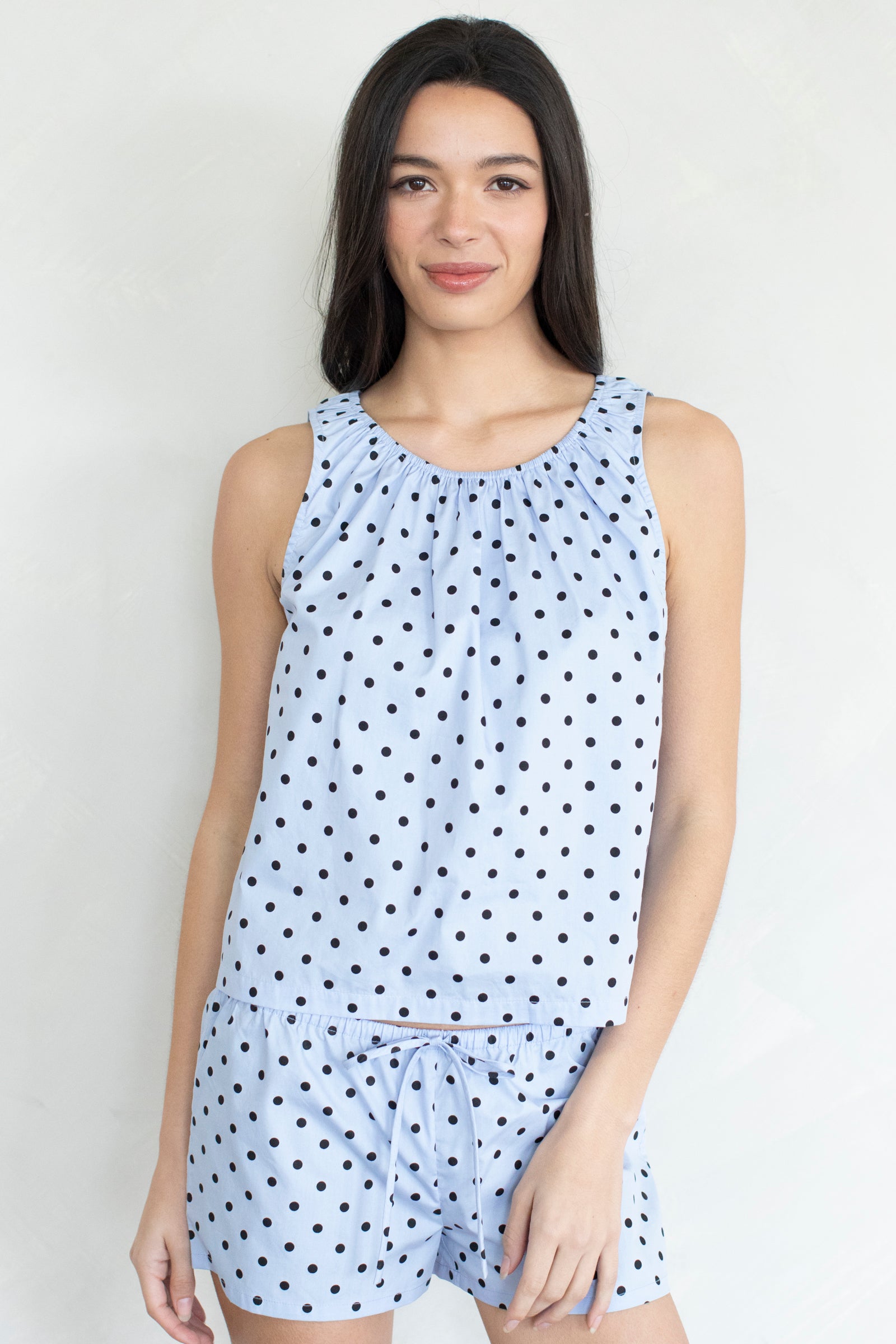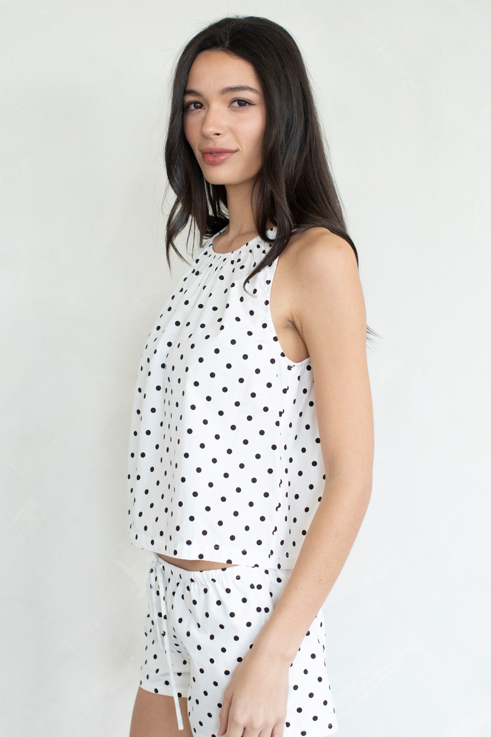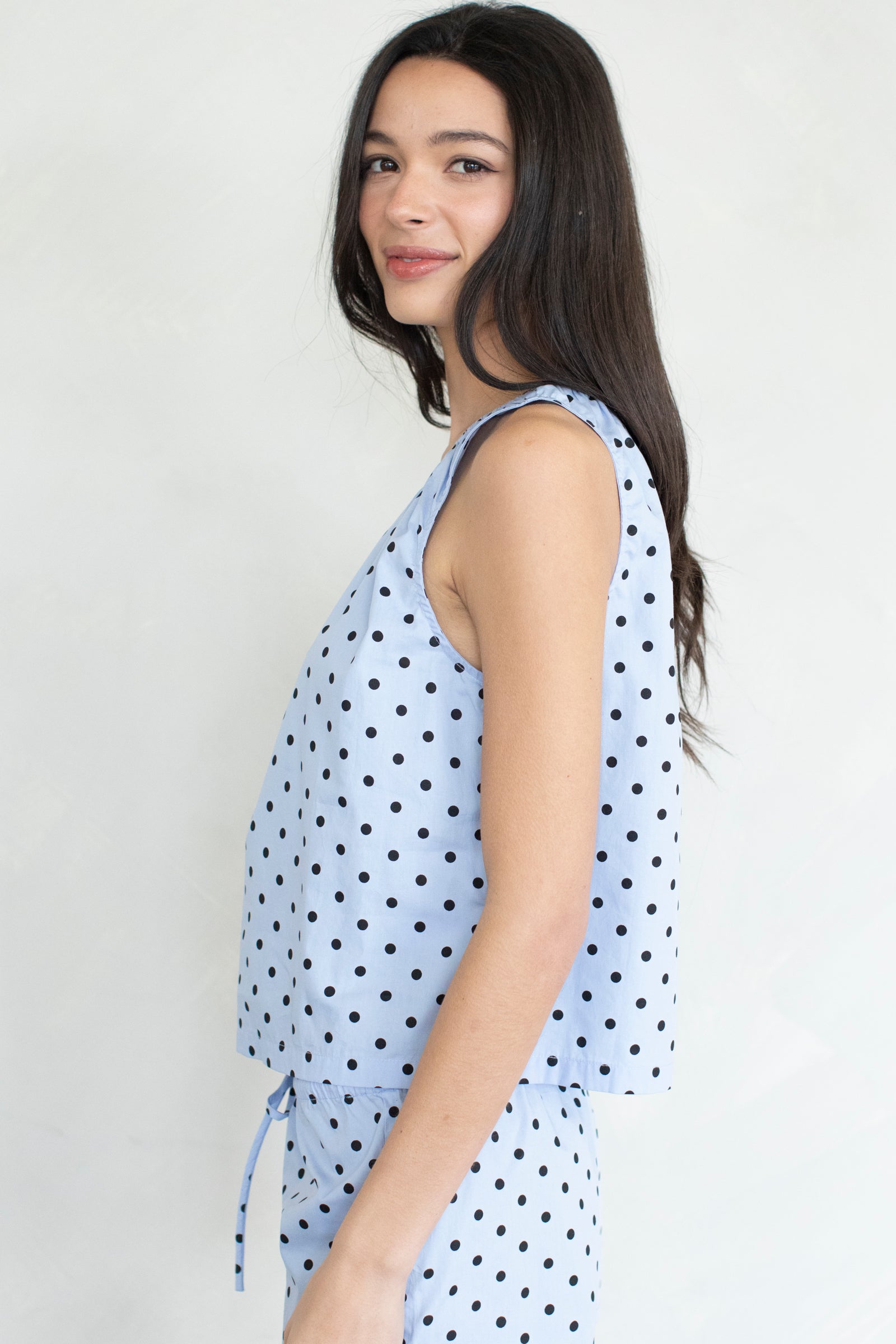 Polka dot, sleeveless blouse. Pairs with our Tina Shorts.
