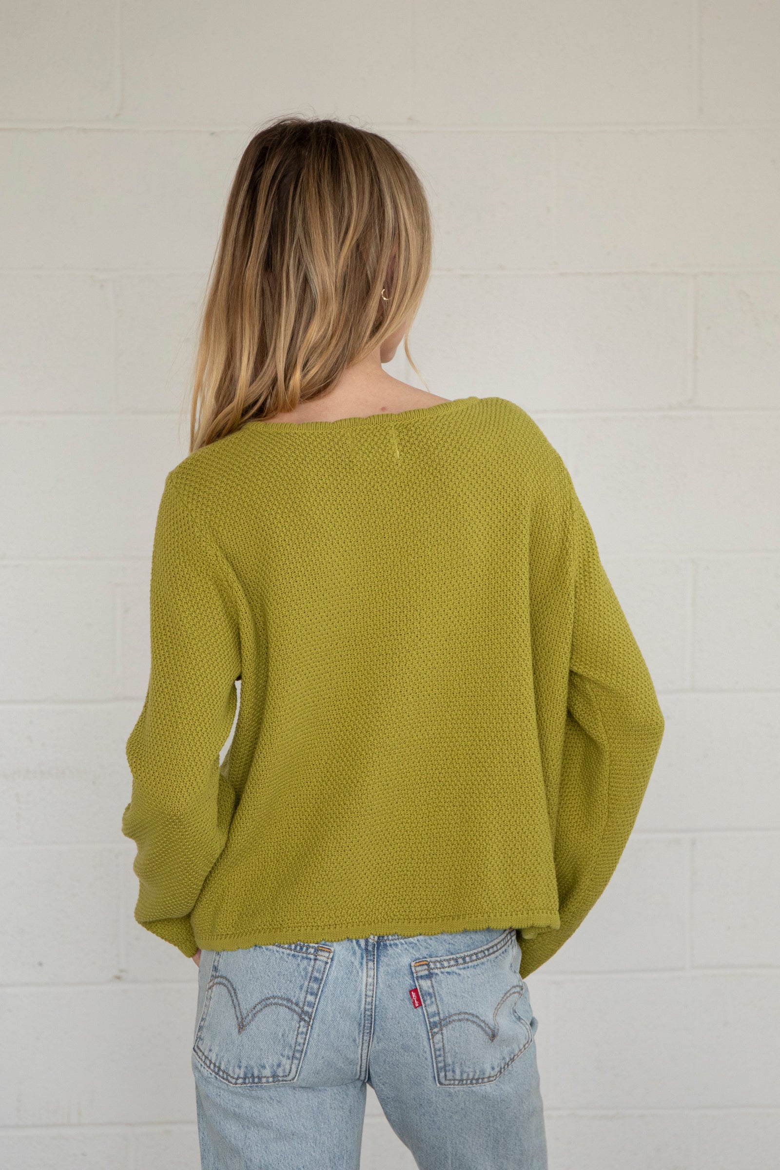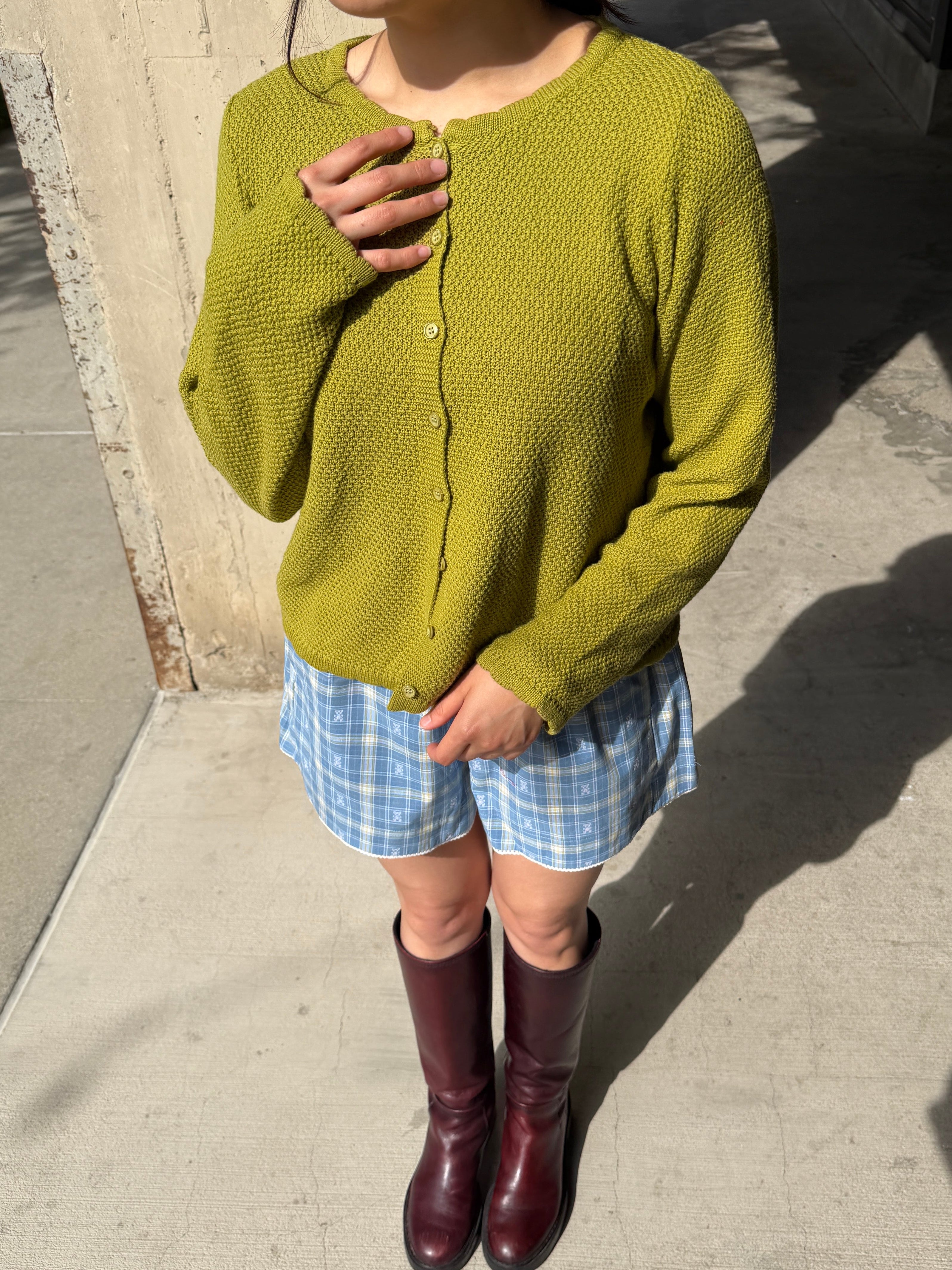 Cotton cardigan with a scoop neck and scalloped edges.