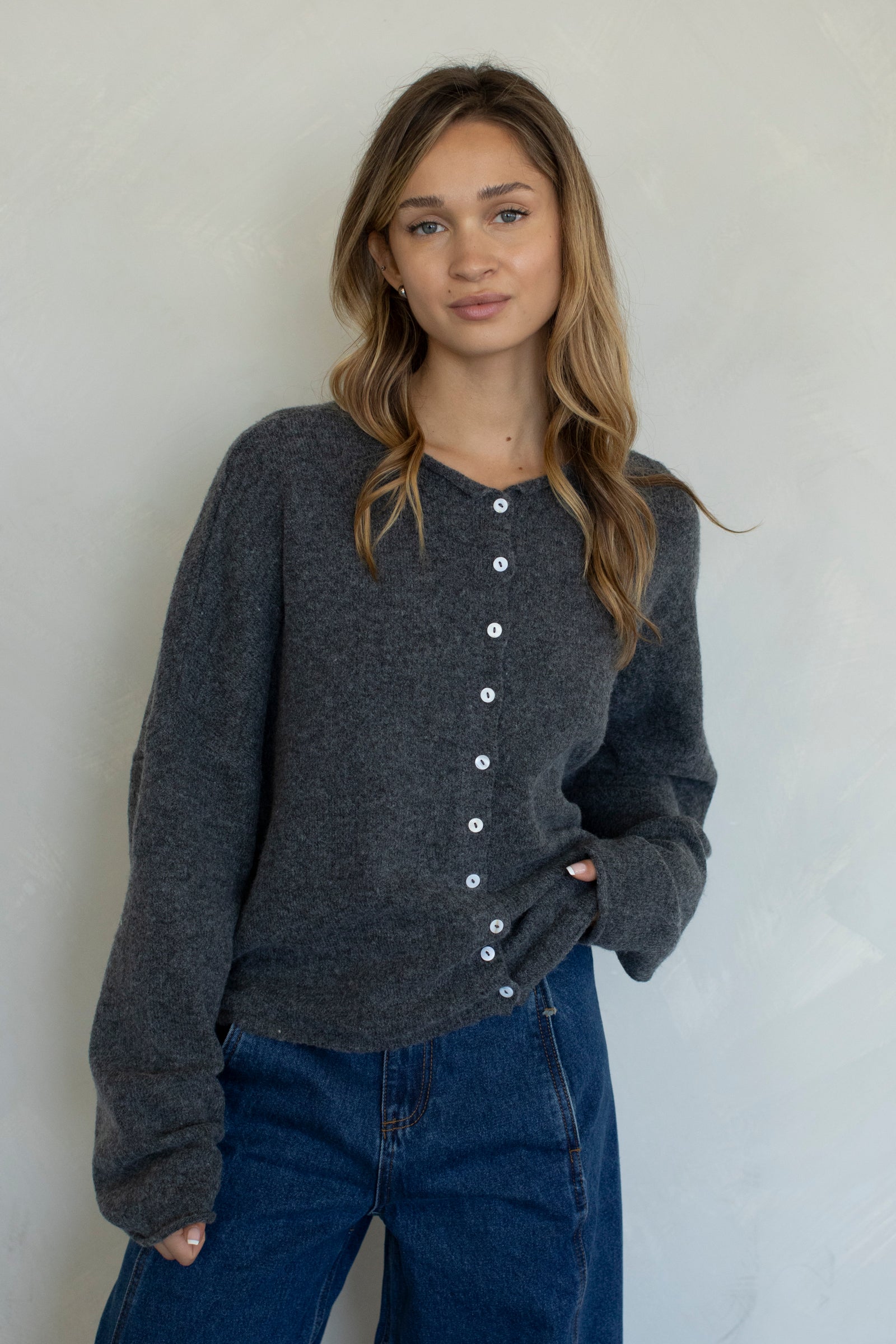 Soft, lightweight cardigan with buttons and a rolled-knit finish.