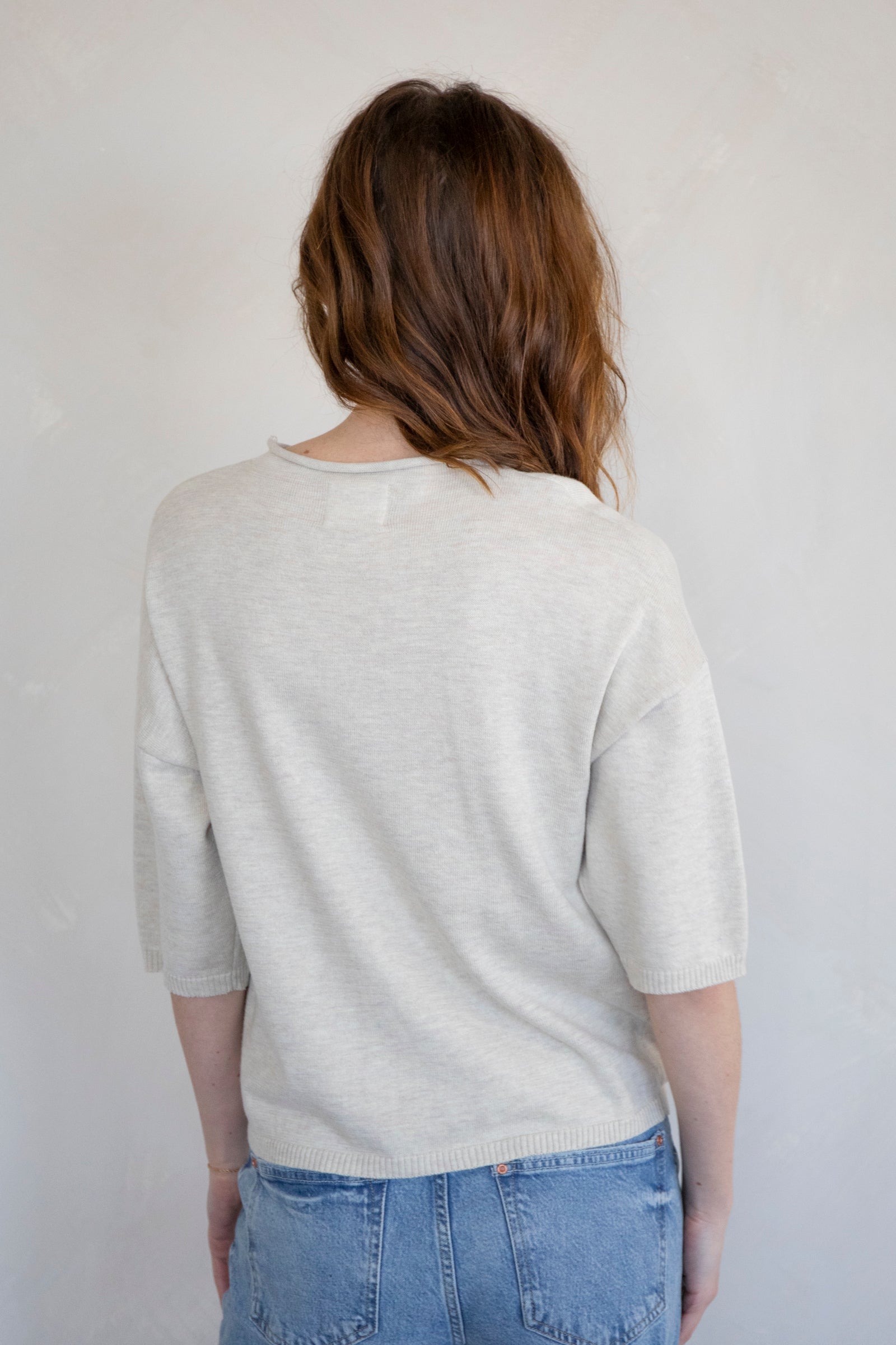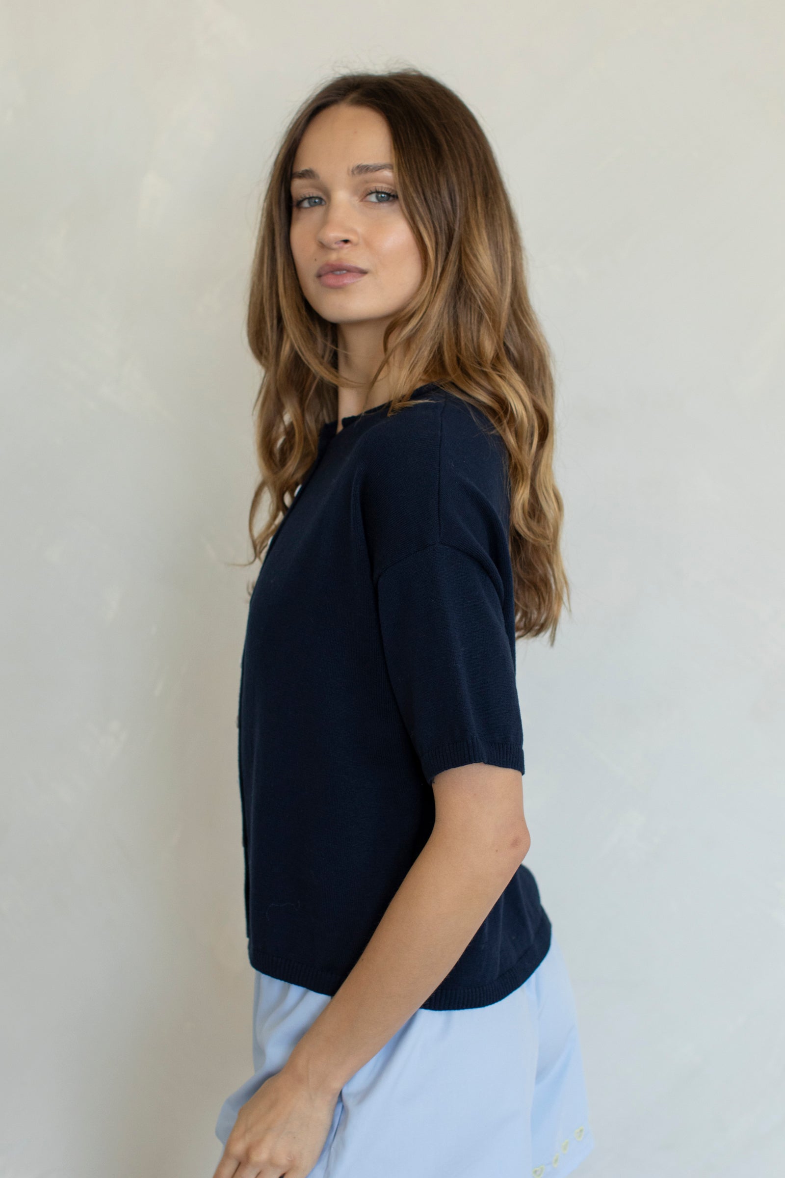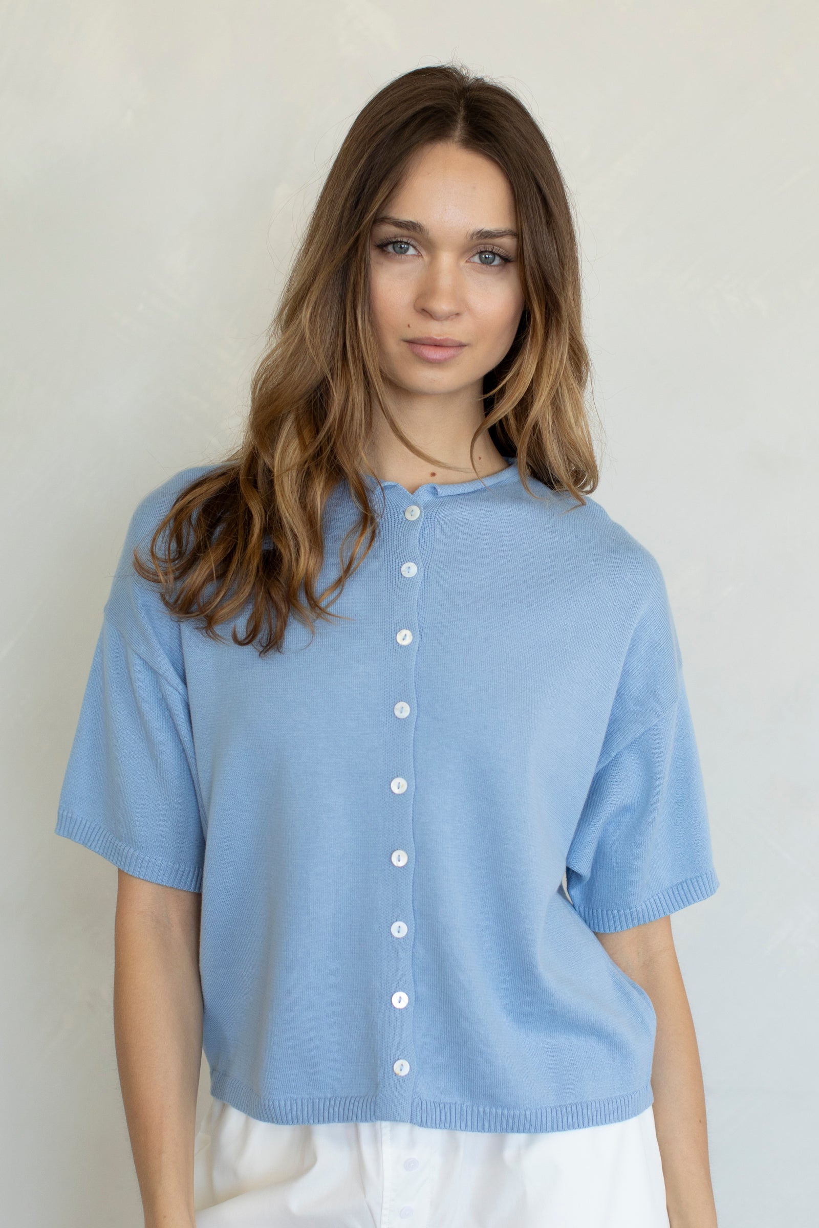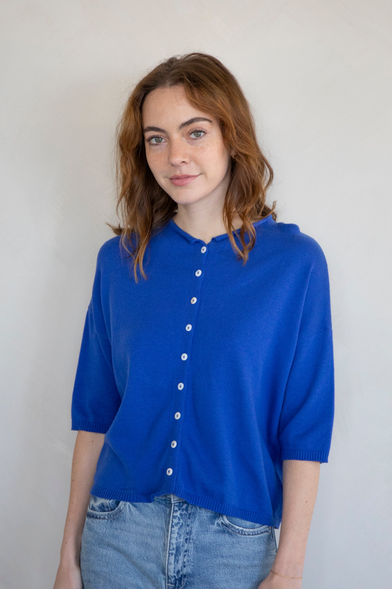 Half-sleeve cotton cardigan with rolled-knit neckline.
