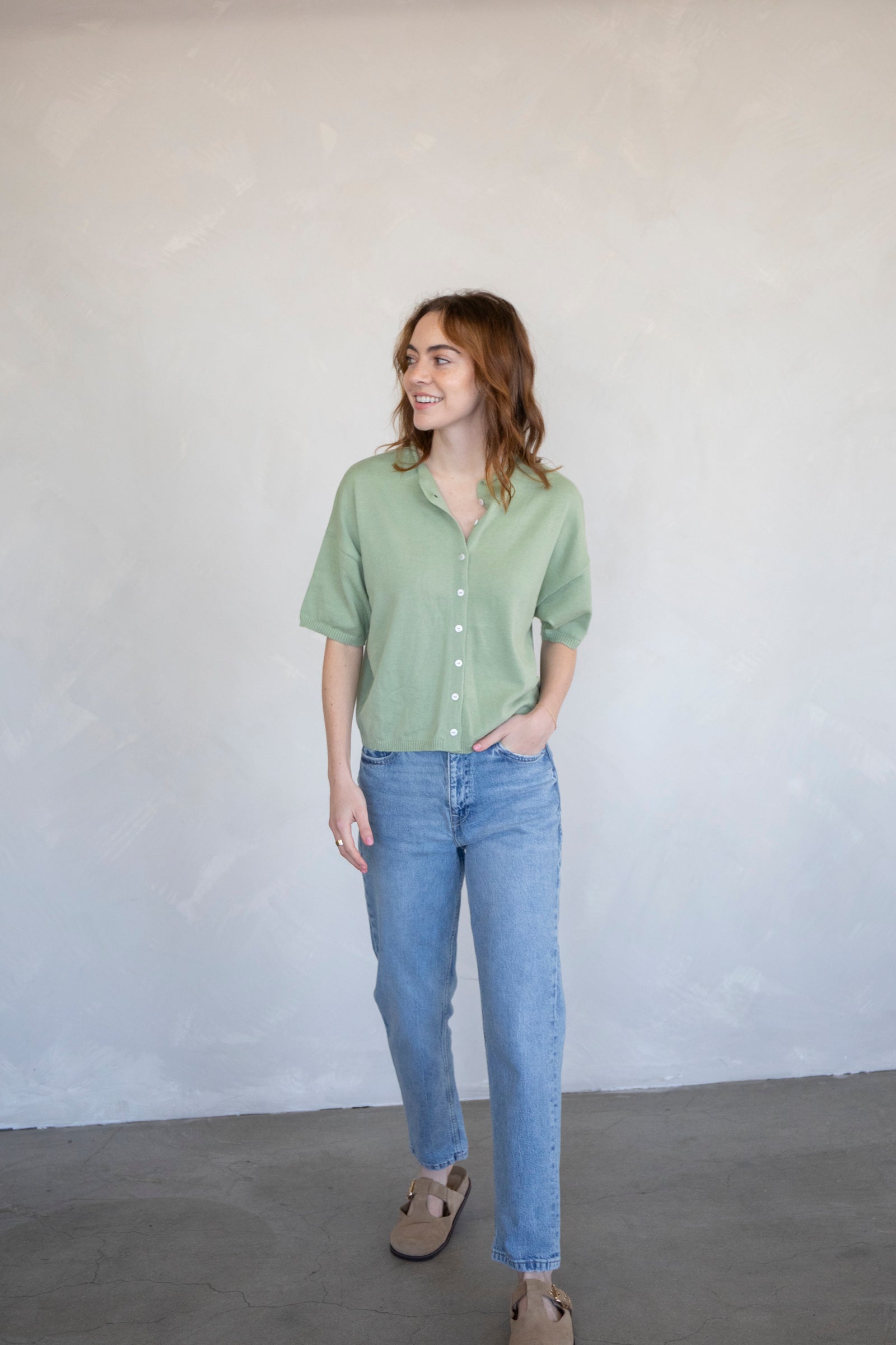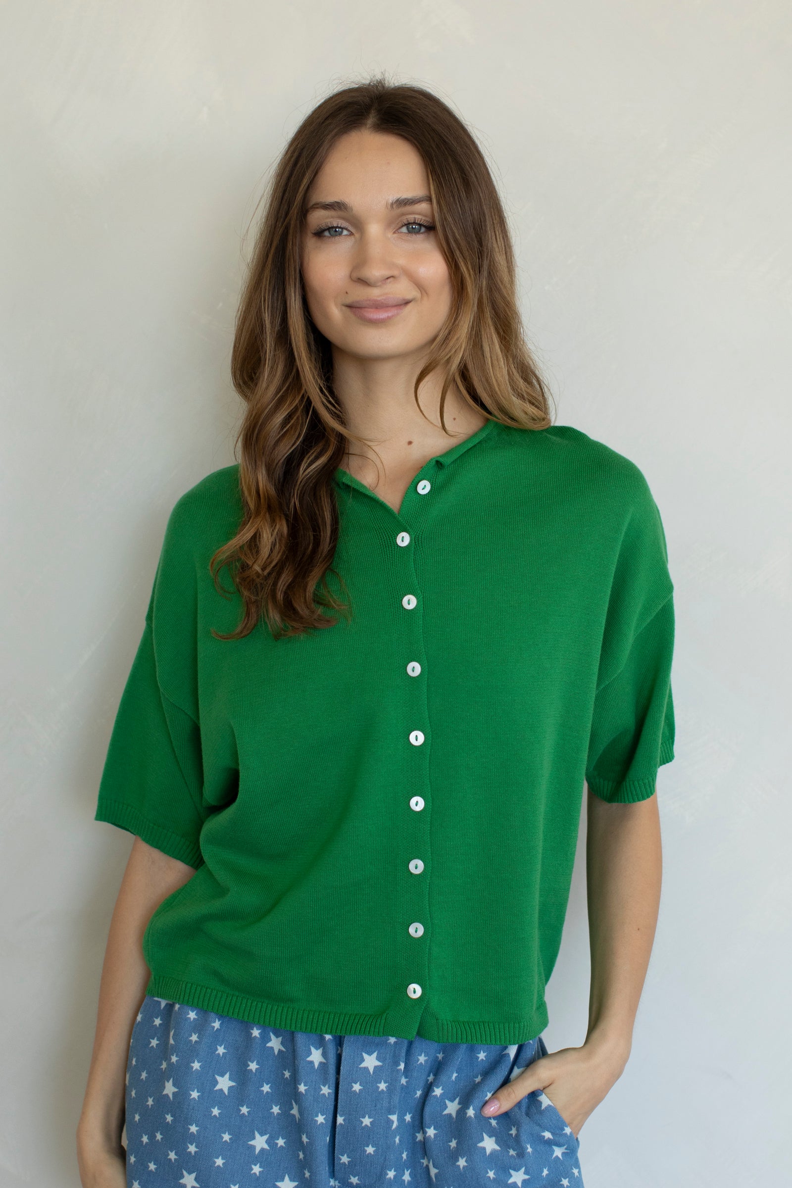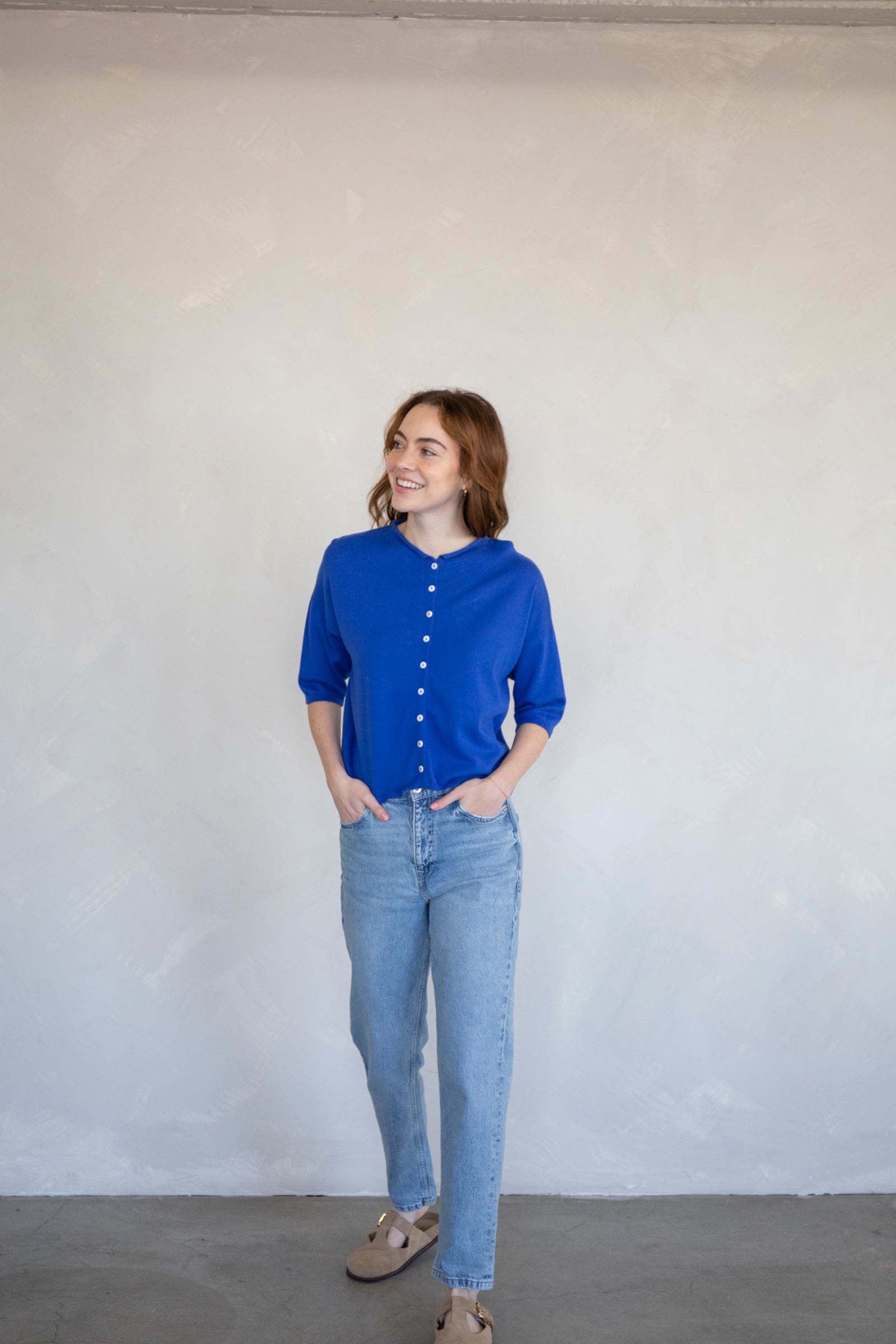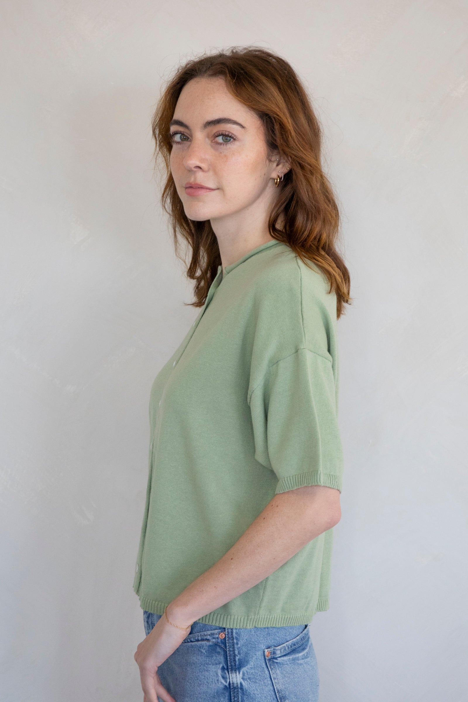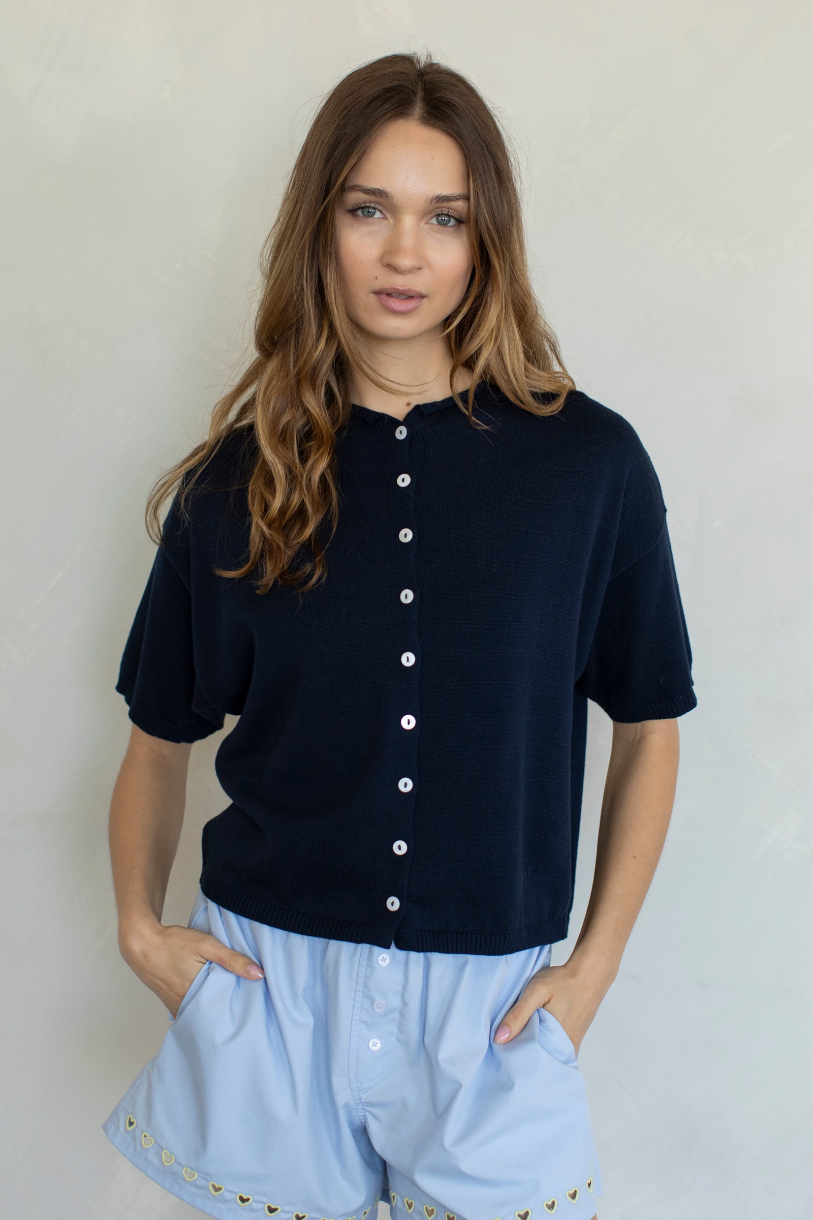 Half-sleeve cotton cardigan with rolled-knit neckline.