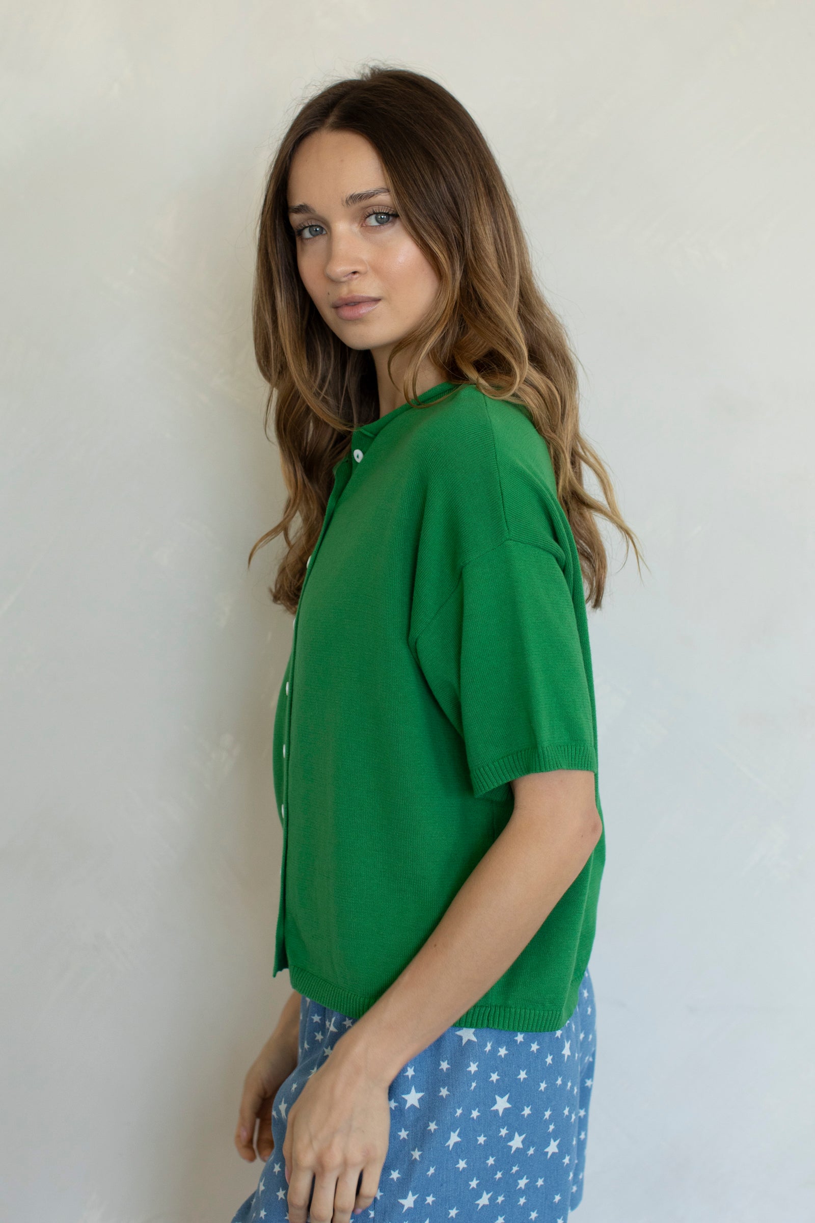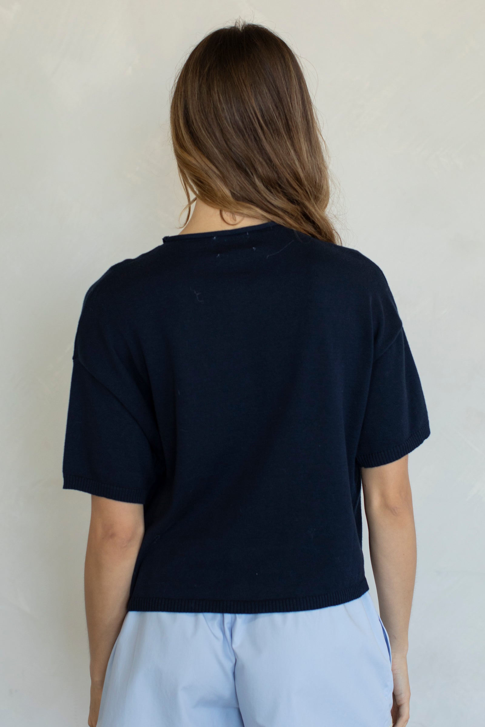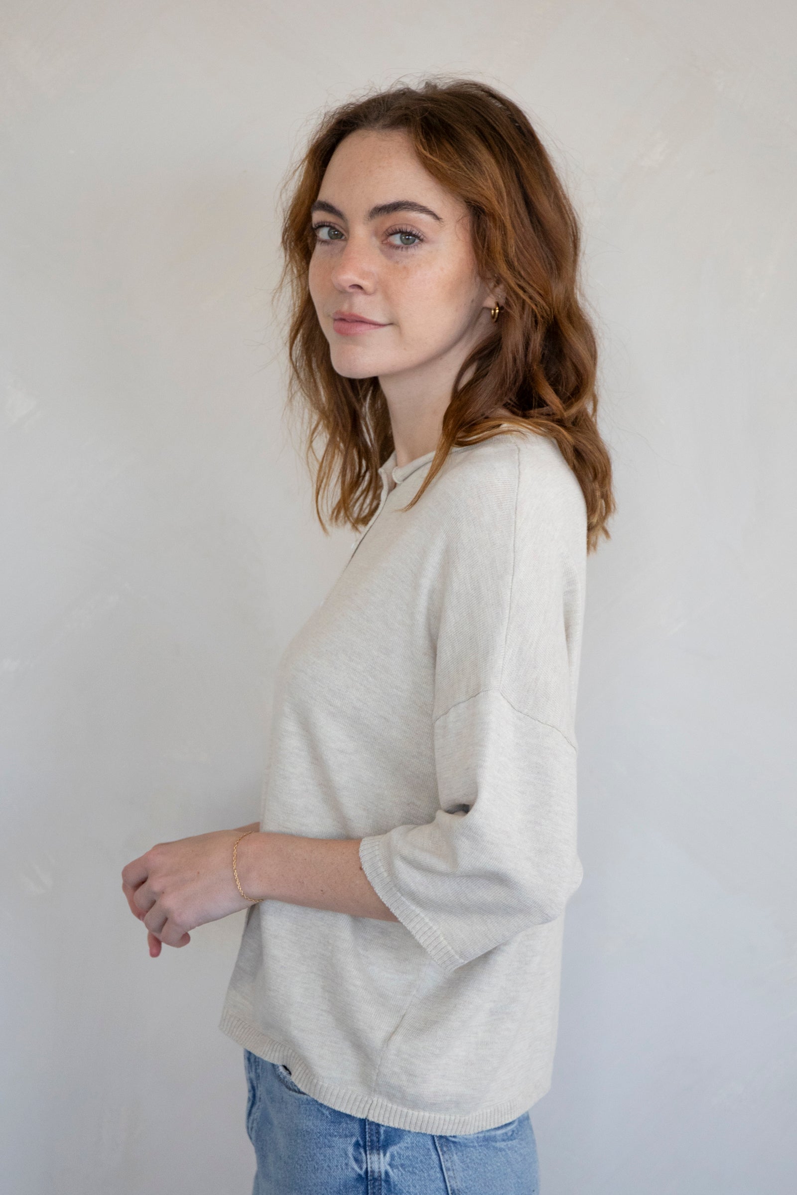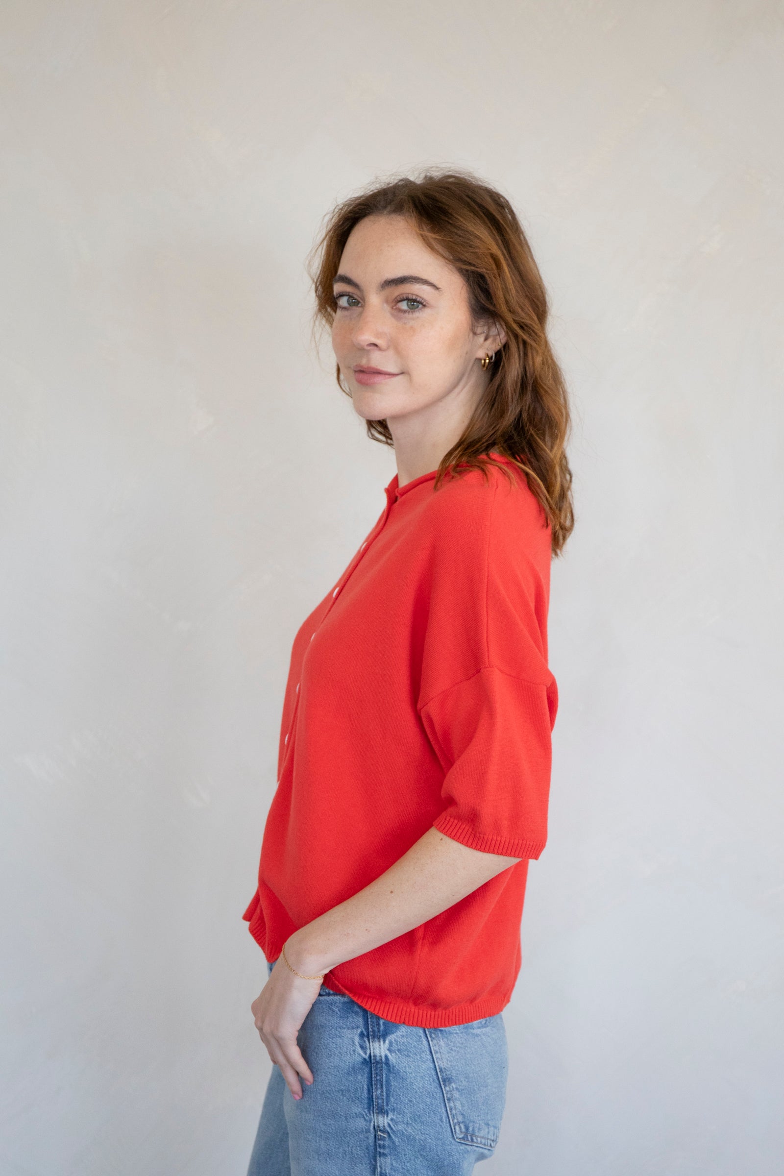 Half-sleeve cotton cardigan with rolled-knit neckline.