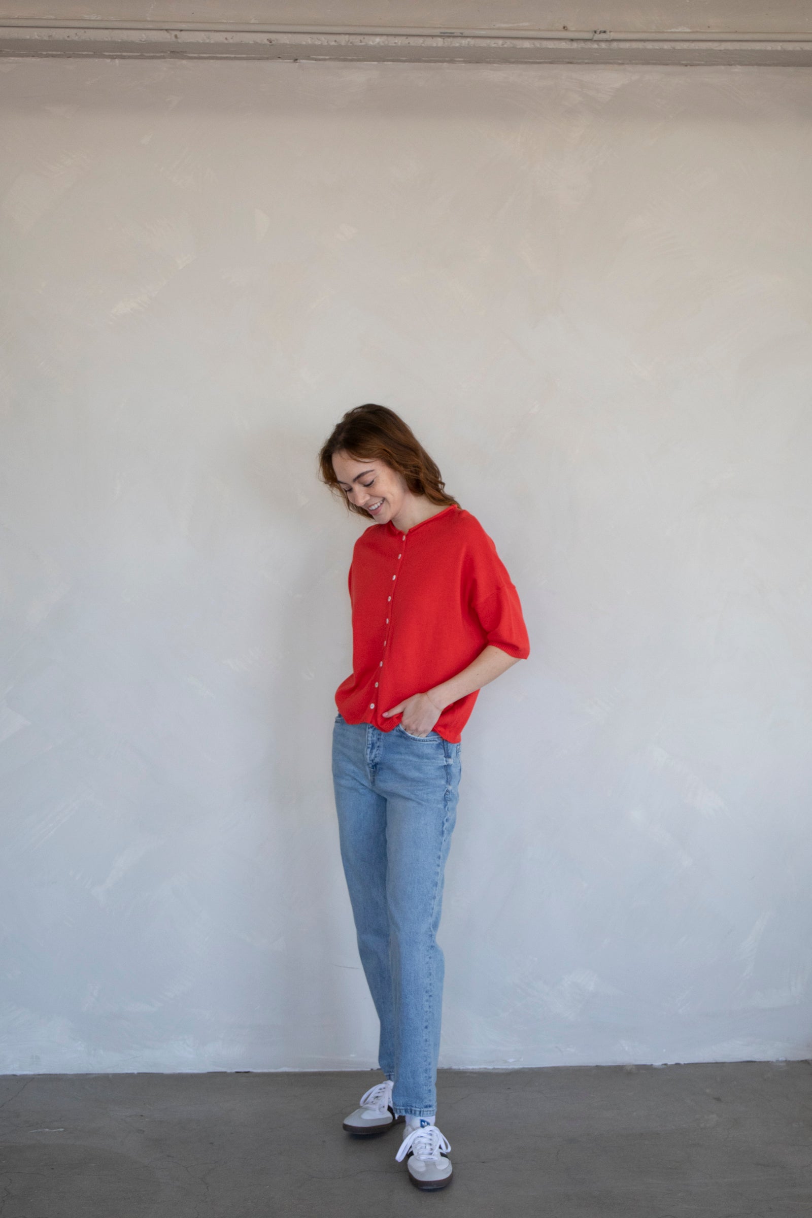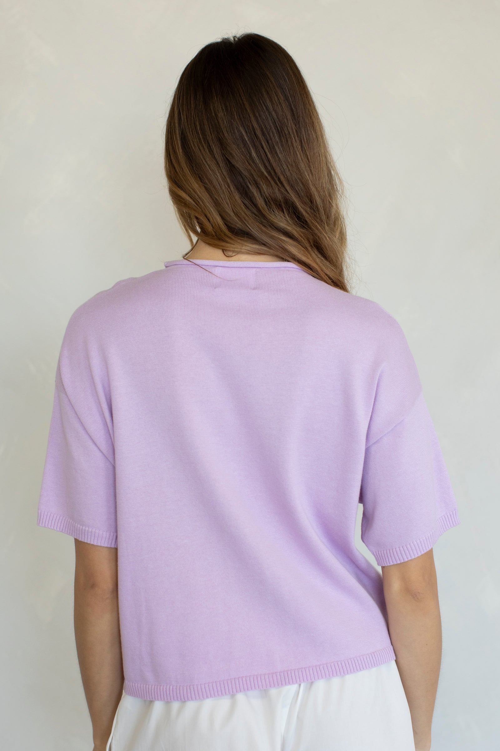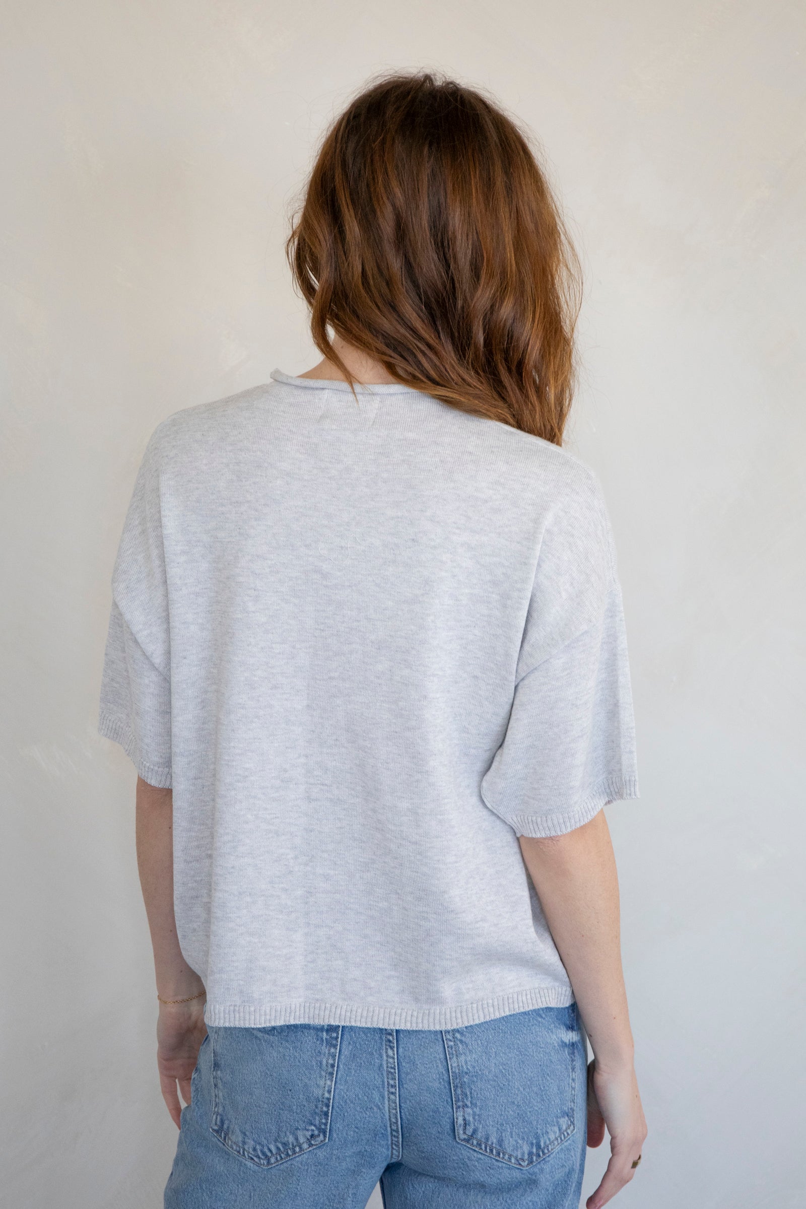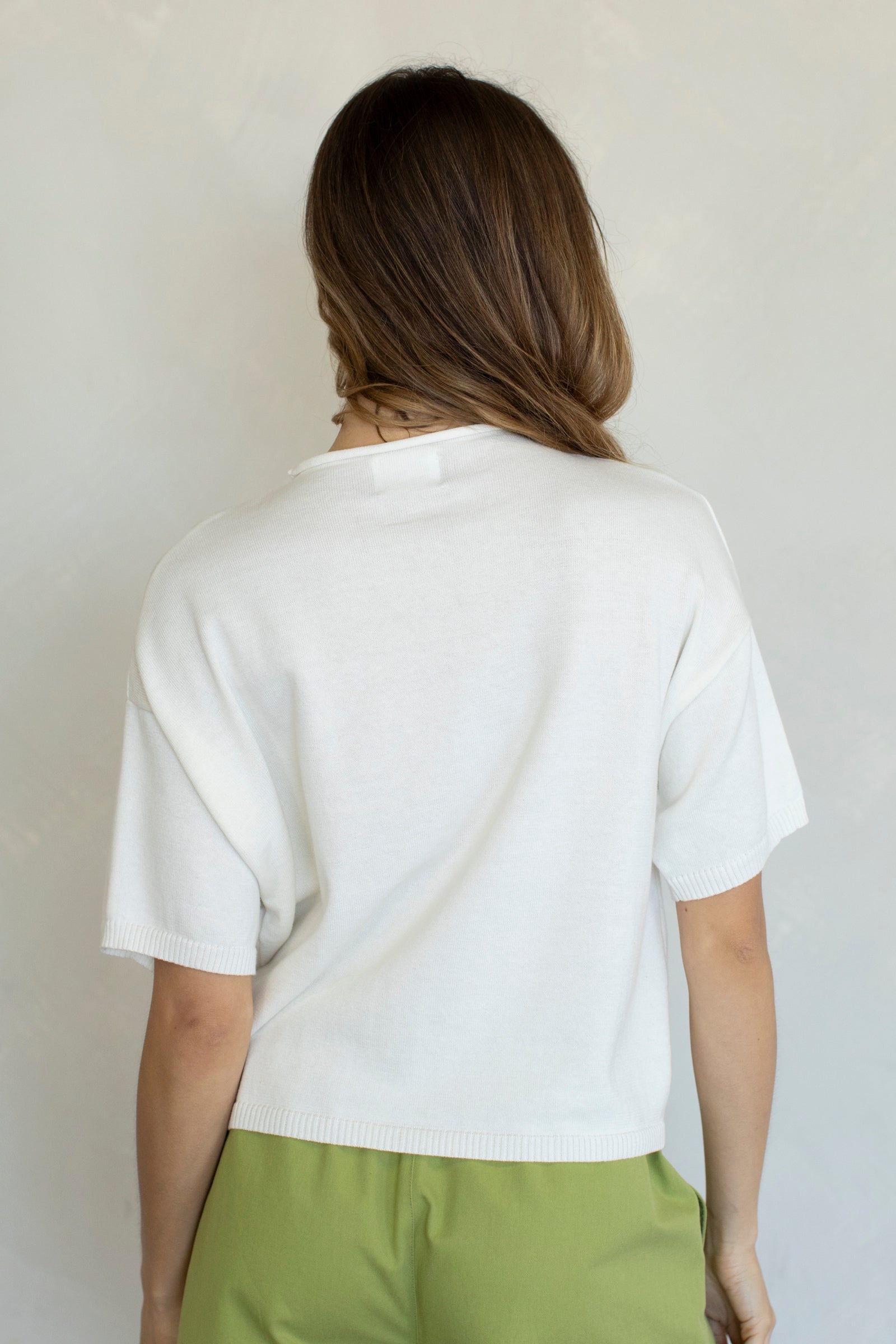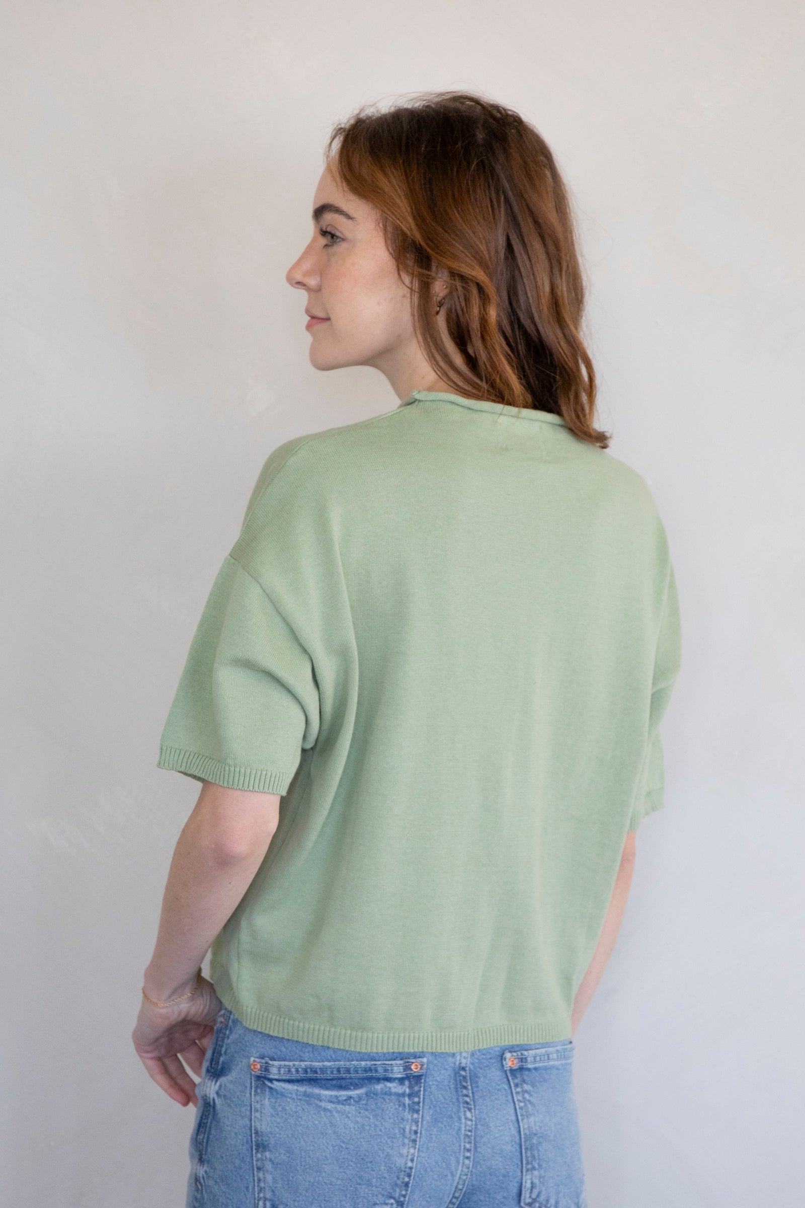 Half-sleeve cotton cardigan with rolled-knit neckline.