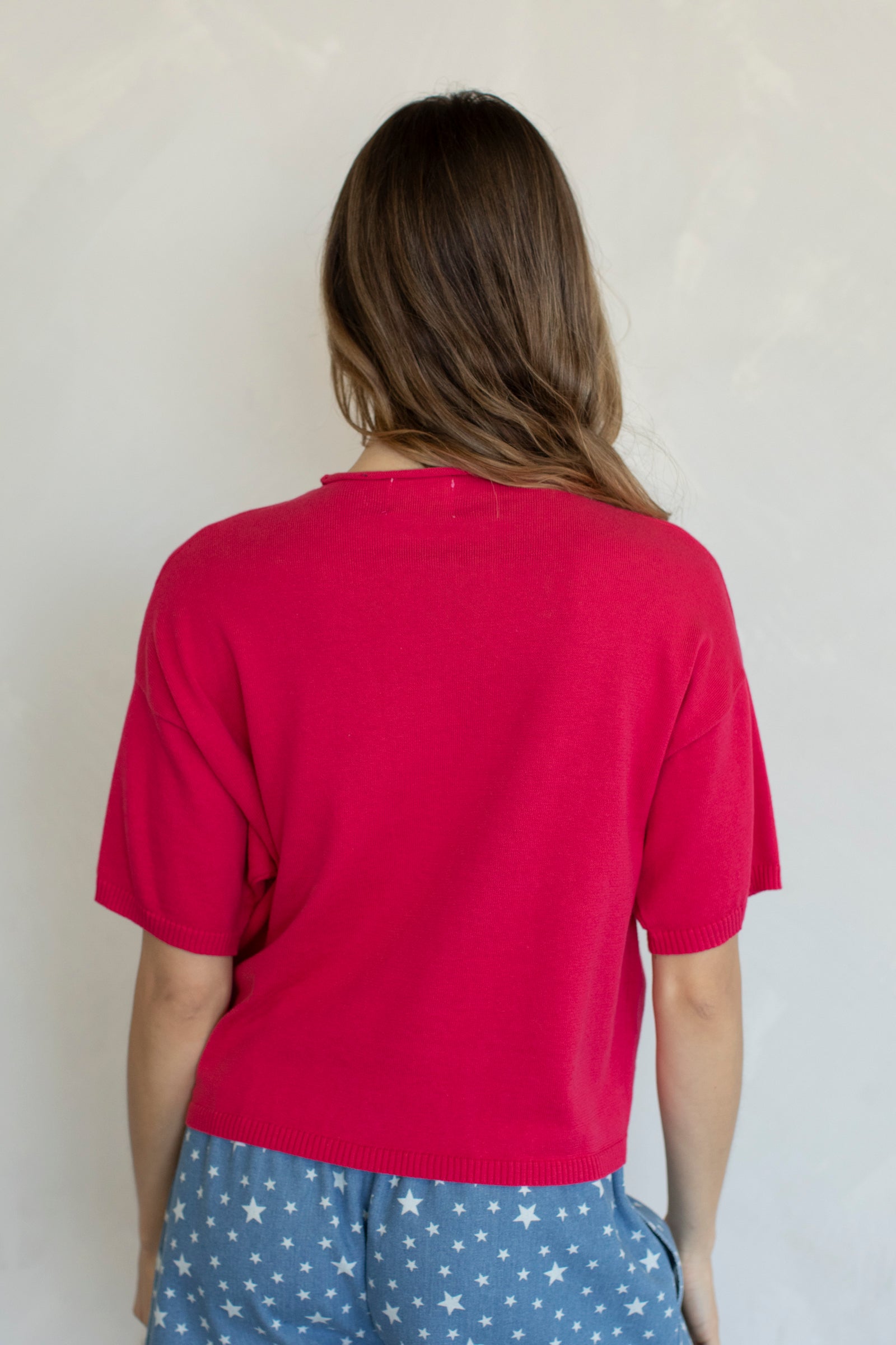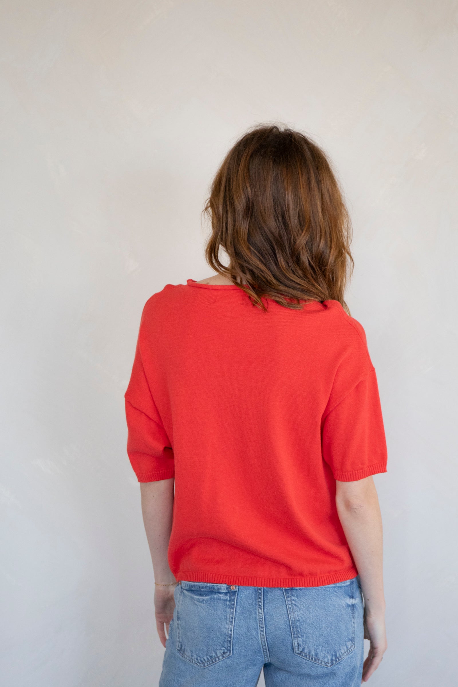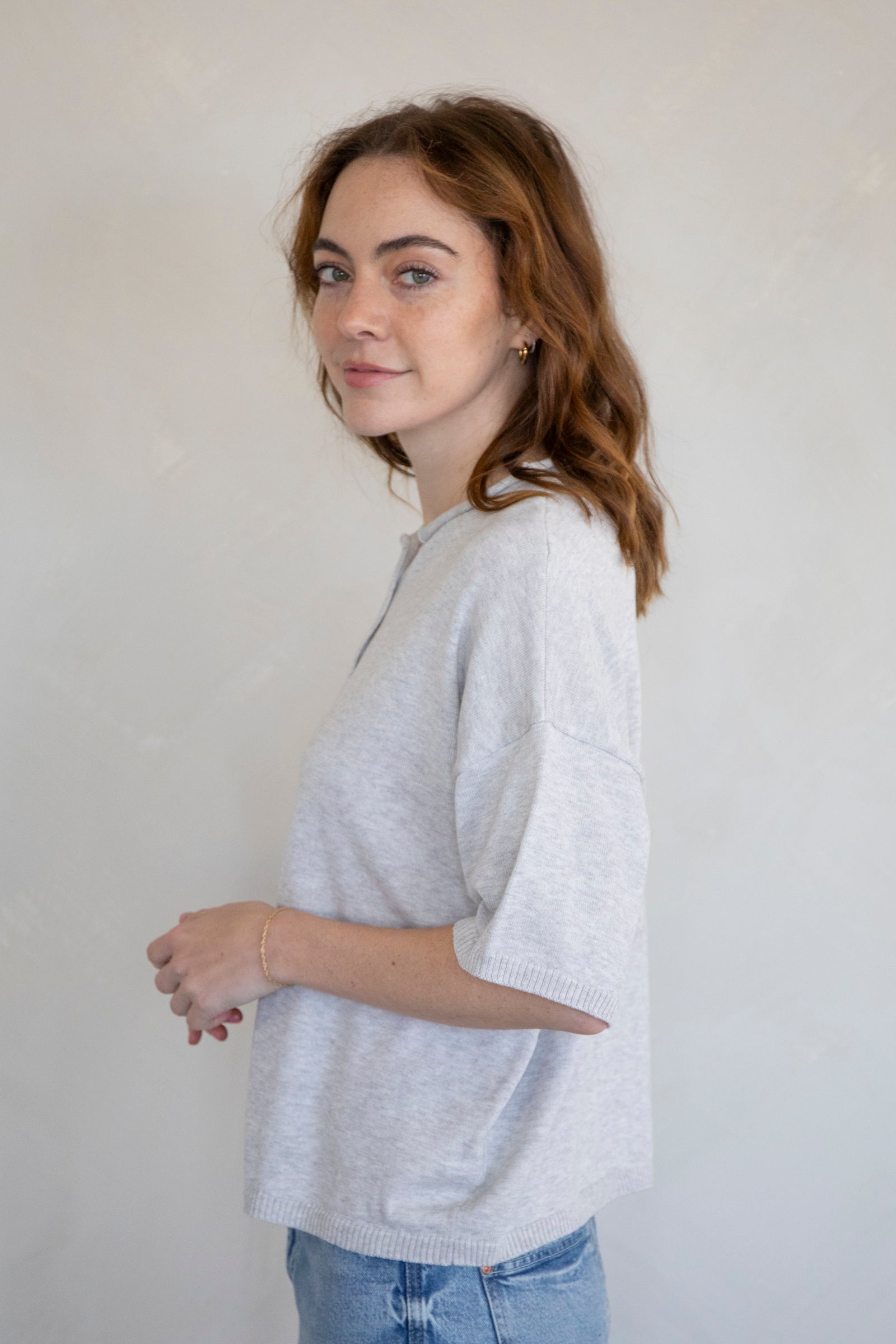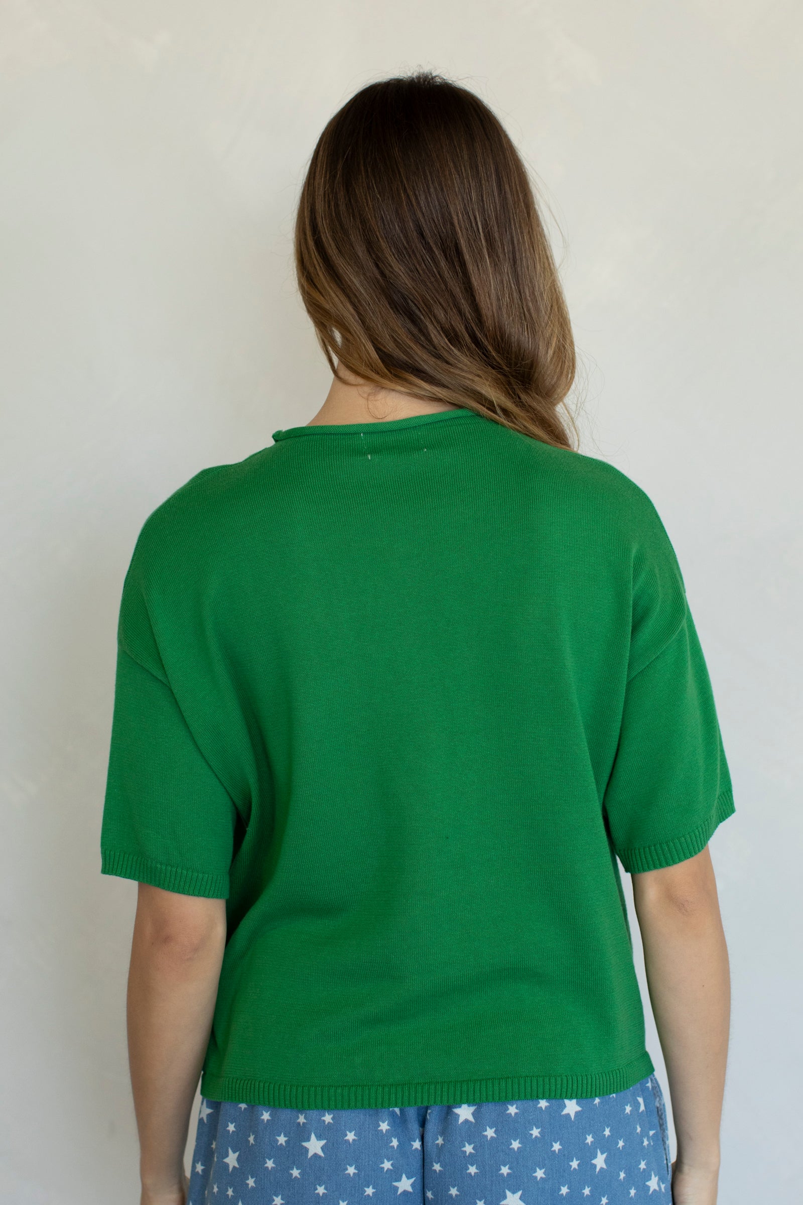 Half-sleeve cotton cardigan with rolled-knit neckline.